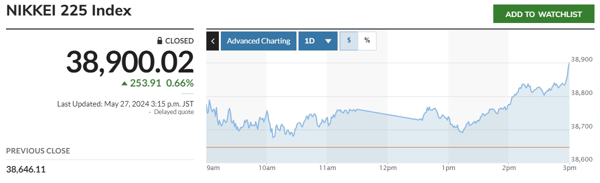 이날 마켓워치와 배런스 등에 따르면 일본증시 닛케이225지수는 전 거래일 대비 253.91포인트(0.66%) 오른 3만8900.02에 장을 마쳤다. 토픽스는 23.82포인트(0.87%) 상승한 2766.36에 마감했다.