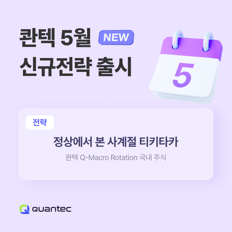 콴텍이 새롭게 출시하는 ‘정상에서 본 사계절 티키타카(콴텍 Q-Macro Rotation 국내 주식)’는 소비자물가, 국내총생산(GDP) 데이터 등 거시경제 데이터를 종합적으로 분석해 포트폴리오를 구성한다. 매번 같은 지표를 사용하는 것이 아니라 현재 경제 상황에 적합한 핵심 재무 지표를 활용하는 탄력적 운용 방식을 적용하고, 이를 바탕으로 투자 매력도가 높은 종목을 선별한다.