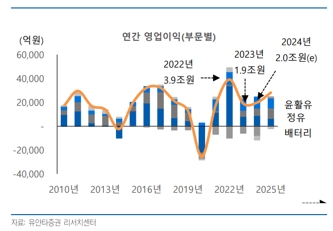 4일 황규원 유안타증권 연구원은 “올해 2분기 예상 실적은 매출액 1조8000억 원, 영업이익 3760억 원, 지배주주 순이익 294억 원 등”이라며 “정제마진 급락으로 정유 부문 실적 감익이 크게 나타나는 가운데 배터리 부문도 적자 폭이 줄어들지만, 여전히 2000억 원 대의 적자가 이어질 것”이라고 했다.