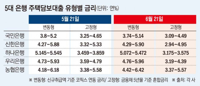 반면 같은 기간 5대 은행의 변동형 주담대 금리는 연 3.74~6.42%다. 지난달 (연 3.8~6.18%) 대비 상단이 0.24%p 올랐다.