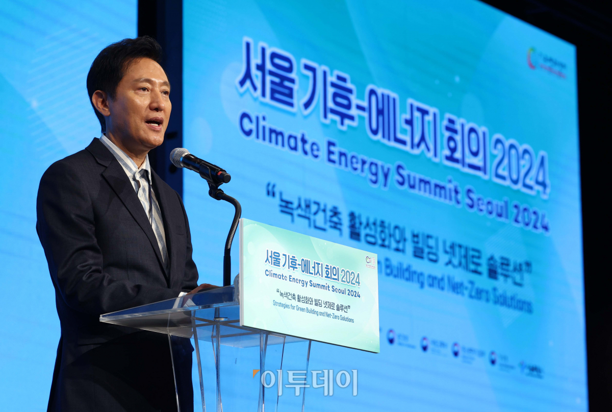 오세훈 서울시장이 27일 서울 여의도 중소기업중앙회에서 열린 ‘서울 기후-에너지 회의 (CESS) 2024’에서 축사를 하고 있다. 이투데이와 기후변화센터가 주최한 CESS 2024에선 스마트 녹색 건축을 활성화하기 위한 시장 동향과 건물 환경 및 기술 융합 현황을 공유하고, 제로 에너지 건축 및 그린 리모델링 분야를 통한 탄소중립 달성과 함께 기술혁신, 일자리 창출, 주거환경 개선, 소득 재분배 등의 사회경제적 개선과제와 그 해결방안에 대해 논의했다.