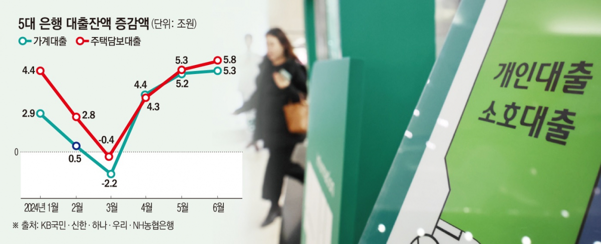 1일 금융권에 따르면 5대 은행(KB국민·신한·하나·우리·NH농협)의 지난달 말 가계대출 잔액은 708조5723억 원으로 5월 말(703조2308억 원)보다 5조3415억 원 증가했다. 가계대출은 올 3월(-2조2238억 원) 이후 세 달 연속 증가세다. 증가 규모는 지난 2021년 7월(6조2009억 원)이후 2년 11개월 만에 최대 폭으로, 5월(5조2278억 원)보다 더 늘었다.