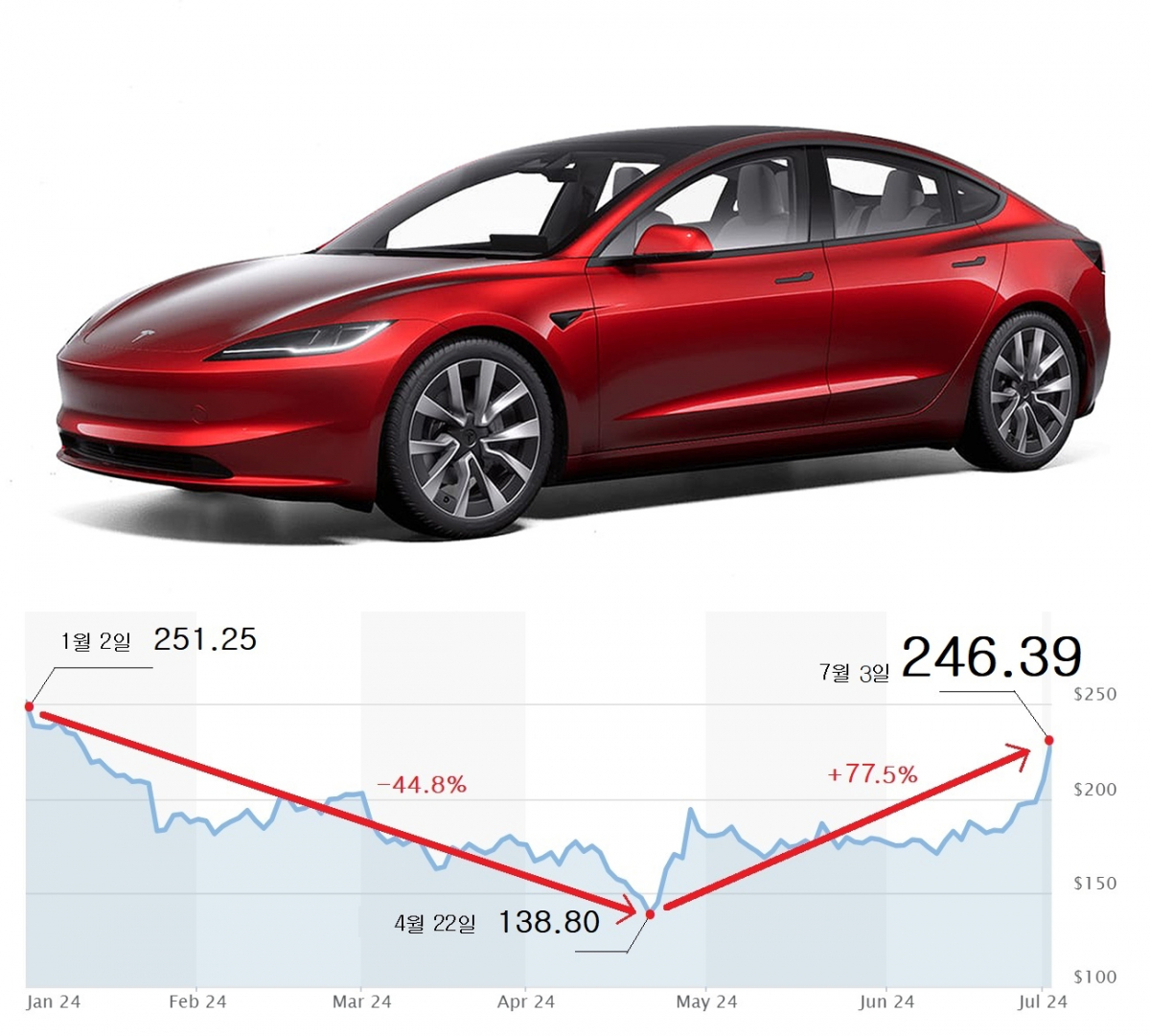 작년 연말 248.48달러, 올해 첫 거래일 종가가 251.25달러였던 테슬라는 이후 하락을 거듭했다. 결국 지난 4월 22일에는 주가가 138.80달러까지 떨어진 바 있다. 3개월여 만에 낙폭이 44.8%에 달해 사실상 주가는 반 토막 났다.