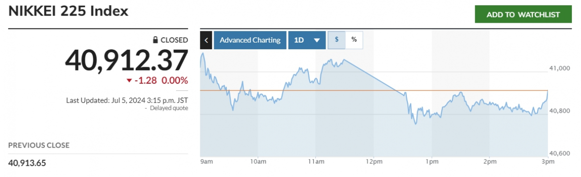 이날 마켓워치와 배런스 등에 따르면 일본 닛케이225 지수는 전 거래일 대비 1.28포인트 내린 4만0912.37로 마감했다. 변동률은 0.00%에 그쳤다.