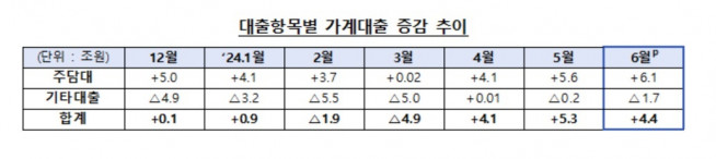 금융위원회와 금융감독원이 10일 발표한 ‘2024년 6월 중 가계대출 동향(잠정)’에 따르면 지난달 전 금융권의 가계대출은 전달보다 4조4000억 원 늘었다. 전달(5조3000억 원) 대비 증가 폭이 다소 축소됐으나 석 달 연속 증가세를 나타냈다. 올해 2월과 3월 두 달 연속 감소하던 가계대출은 4월 4조1000억원 늘며 증가세로 전환했고, 5월 역대 최대 증가 폭을 기록한 바 있다.