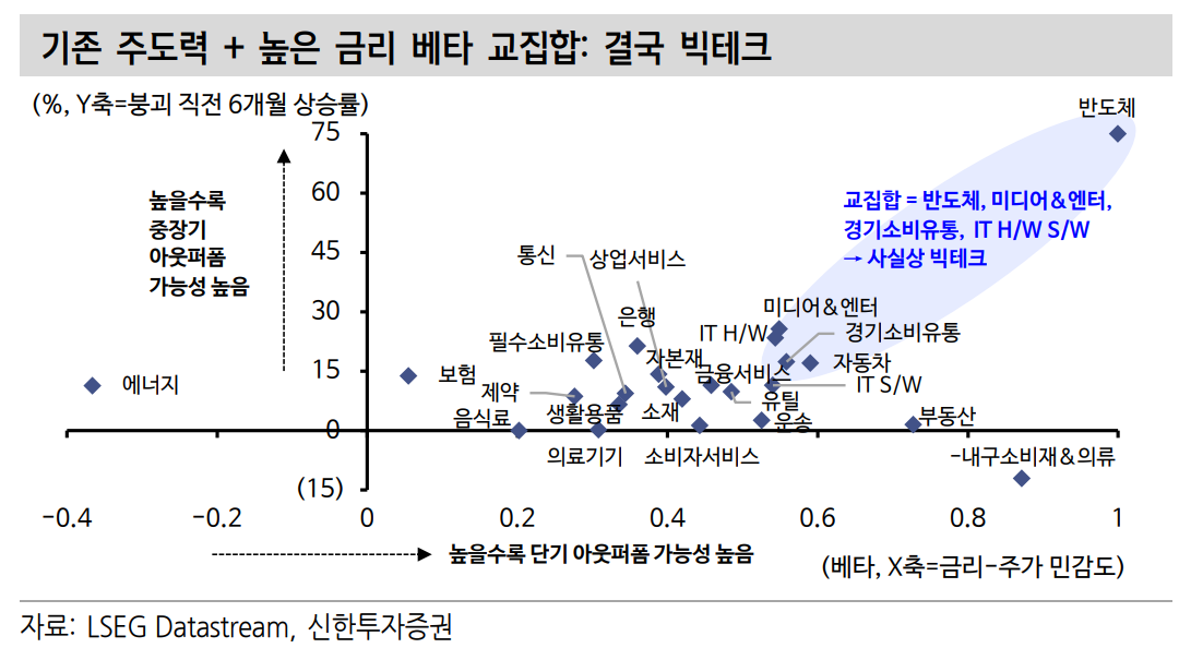 그는 “현재 교집합에 위치하고, 이익이 견고한 업종들은 반도체, 미디어&엔터, 경기소비유통, 정보기술(IT) 하드웨어(H/W), IT 소프트웨어·서비스(S/W)”라며 “결국 빅테크로 요약될 수 있다”고 했다.