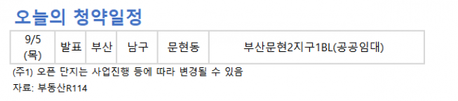부동산 정보업체 부동산R114에 따르면 5일인 오늘은 부산 남구 ‘부산문현2지구1BL’(공공임대) 당첨자를 발표한다.
