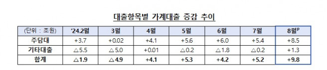 다만 "가을철 이사 수요 및 부동산 가격 상승세, 금리인하 기대감 등으로 인해 가계부채 증가세가 언제든지 확대될 수 있는 만큼, 주택담보대출 뿐만 아니라 풍선효과가 우려되는 신용대출과 2금융권 대출 등을 포함한 가계부채 증가 양상과 추이를 면밀히 모니터링해 나갈 것"이라며 "은행 등 금융회사들도 책임감을 가지고 대출관리에 만전을 기해주기를 바란다"고 당부했다.