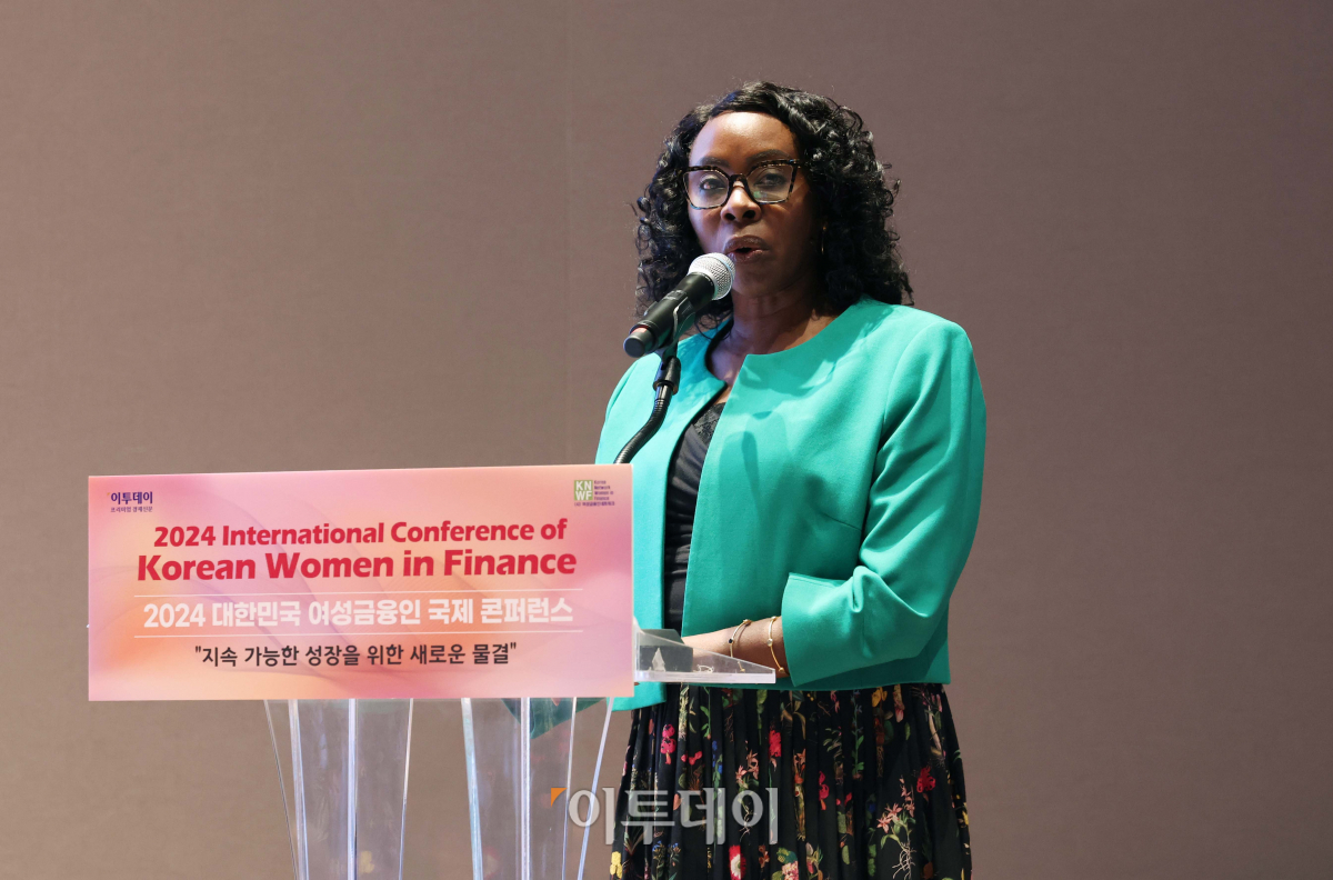 크리스티나 온고마 IFC 동북아시아·태평양 총괄 본부장이 20일 서울 여의도 한국거래소에서 열린 ‘2024 대한민국 여성금융인 국제 콘퍼런스’에서 기조연설을 하고 있다. 경제신문 이투데이와 여성금융인네트워크가 “성별 임금 격차에 대한 포용적 과제 (Inclusive Solutions in Addressing the Gender Pay Gap)”를 주제로 공동 주최한 이번 여성금융인 국제 콘퍼런스에선 참가자들의 경험과 연구를 바탕으로, 다양한 글로벌 및 국내 사례를 공유하여 성별 임금 격차를 줄이기 위한 실질적인 해결 방안을 모색했다.