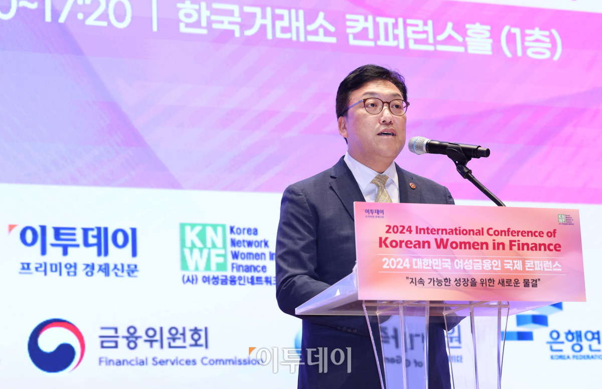 김병환 금융위원장이 20일 서울 여의도 한국거래소에서 열린 ‘2024 대한민국 여성금융인 국제 콘퍼런스’에서 축사를 하고 있다. 경제신문 이투데이와 여성금융인네트워크가 “성별 임금 격차에 대한 포용적 과제 (Inclusive Solutions in Addressing the Gender Pay Gap)”를 주제로 공동 주최한 이번 여성금융인 국제 콘퍼런스에선 참가자들의 경험과 연구를 바탕으로, 다양한 글로벌 및 국내 사례를 공유하여 성별 임금 격차를 줄이기 위한 실질적인 해결 방안을 모색했다.