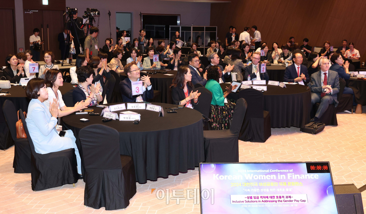20일 서울 여의도 한국거래소에서 열린 ‘2024 대한민국 여성금융인 국제 콘퍼런스’에서 참석자들이 박수를 치고 있다. 경제신문 이투데이와 여성금융인네트워크가 “성별 임금 격차에 대한 포용적 과제 (Inclusive Solutions in Addressing the Gender Pay Gap)”를 주제로 공동 주최한 이번 여성금융인 국제 콘퍼런스에선 참가자들의 경험과 연구를 바탕으로, 다양한 글로벌 및 국내 사례를 공유하여 성별 임금 격차를 줄이기 위한 실질적인 해결 방안을 모색했다.