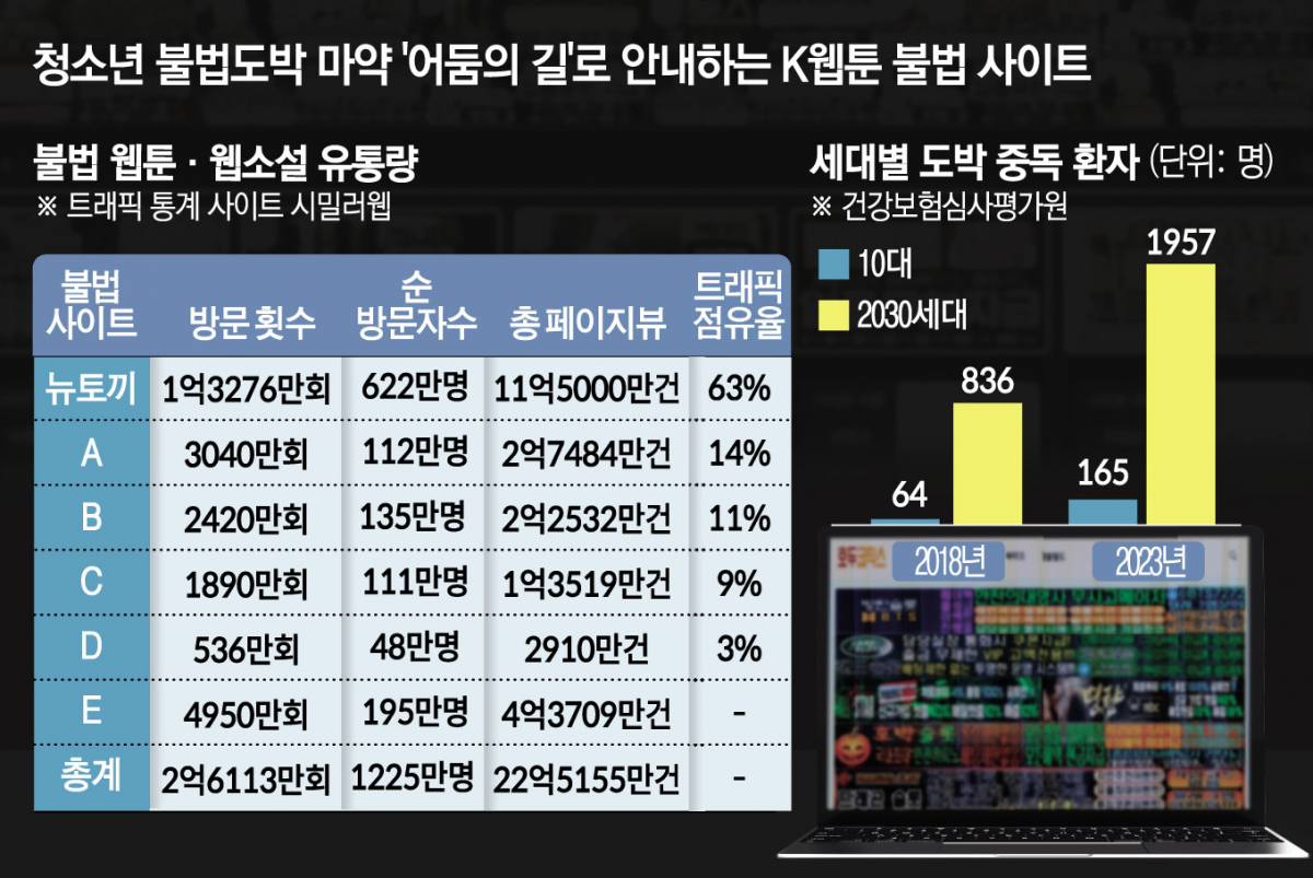 한국콘텐츠진흥원이 발표한 '2023 만화웹툰 이용자 실태조사'에 따르면 웹툰·디지털 페이지 만화 이용자 중 61.3%가 웹툰·만화를 불법 이용한 경험이 있다고 답했다. 10명 중 6명은 웹툰·만화를 불법 이용했다는 점을 감안하면 간과할 수 없는 영향력을 행사하고 있는 것으로 보인다. 이 때문에 전 세계로 뻗어 나가는 K웹툰이 불법 도박의 창구로 전락하는 게 아니냐는 우려마저 커지고 있다.