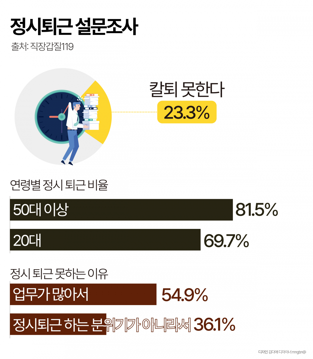 직장갑질119 온라인노조 추진위원회가 여론조사 전문기관인 글로벌리서치에 의뢰해 지난달 2~10일 직장인 1000명을 대상으로 설문조사를 한 결과, 칼퇴를 하지 못한다는 응답이 23.3%로 조사됐다.