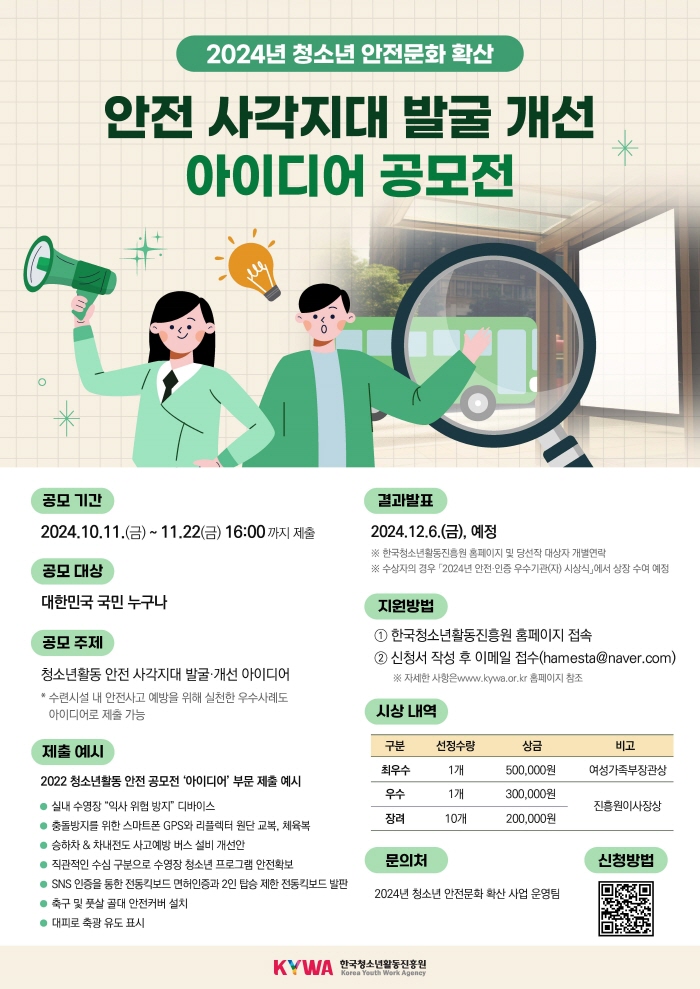 이번 공모전은 안전 사각지대를 발굴하고 개선하기 위한 창의적인 아이디어를 통해 안전한 청소년활동 환경 조성을 목적으로 한다.
