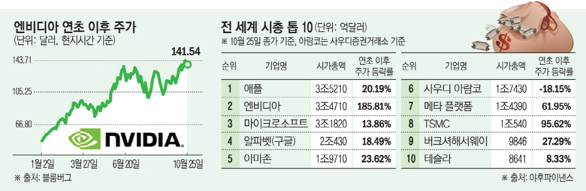 엔비디아 주가는 전날 뉴욕증시에서 장중 한때 2%대로 급등했다. 이에 시총이 3조5300억 달러로 불어나면서 애플(3조5200억 달러)을 제치고 세계 1위에 올랐다.