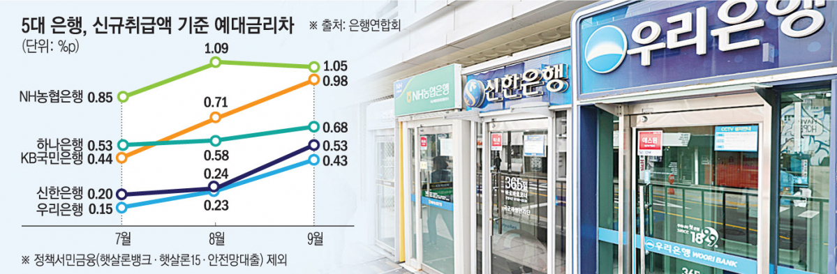 31일 은행연합회 공시에 따르면 지난달 5대 은행(KB국민‧신한‧하나‧우리‧NH농협)의 정책서민금융(햇살론뱅크·햇살론15·안전망대출)을 뺀 신규취급액 기준 평균 가계예대금리차는 0.73%포인트(p)로 전월(0.57%p) 대비 0.16%p 확대됐다. 올해 4월(0.764%p) 이후 7월까지 하락세를 이어가다 8월부터 확대 전환했다.
