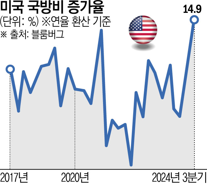 2022년 2월부터 시작된 우크라이나 전쟁으로 우크라이나에 대한 군사적 지원이 계속되면서 미국의 국방비 지출이 최근 2년 새 급격히 증가했다. 여기에 팔레스타인 무장단체 하마스의 기습공격으로 시작된 가자전쟁이 최근 레바논 친(親)이란 무장단체 헤즈볼라로 확전되는 등 중동의 군사적 긴장까지 겹치면서 3분기 미국 국방비 지출이 크게 불어났다고 블룸버그는 설명했다.