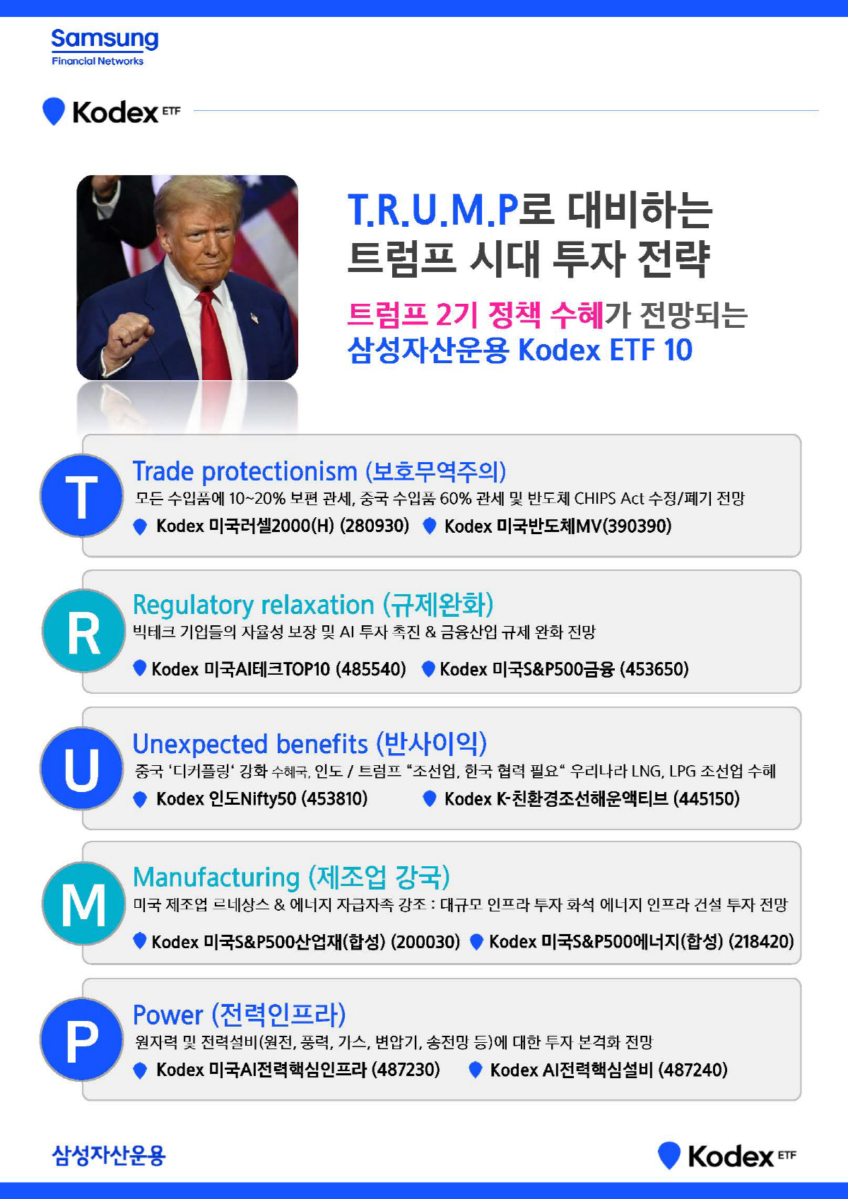 삼성자산운용은 트럼프 2기 정부가 정책적으로 강조할 분야를 중심으로 5가지 키워드 보호무역주의(Trade protectionism)와 규제 완화(Regulatory relaxation), 반사이익(Unexpected benefits), 제조업 강국(Manufacturing), 전력인프라(Power)를 선정하고, 키워드에 맞춰서 투자할 수 있는 KODEX ETF를 엄선했다.
