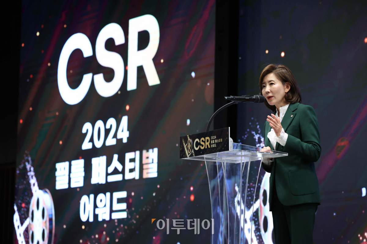 나경원 국민의힘 의원이 21일 서울 여의도 중소기업중앙회에서 열린 '2024 CSR 필름 페스티벌 어워드’에서 축사를 하고 있다. 경제신문 이투데이가 주최한 이 행사는 한 해 동안 사회적 가치 창출을 위한 CSR 활동 발자취를 공모하고 그 업적을 격려하기 위해 마련된 자리로 2012년 첫걸음을 내디뎌 올해로 13회째를 맞이했다.