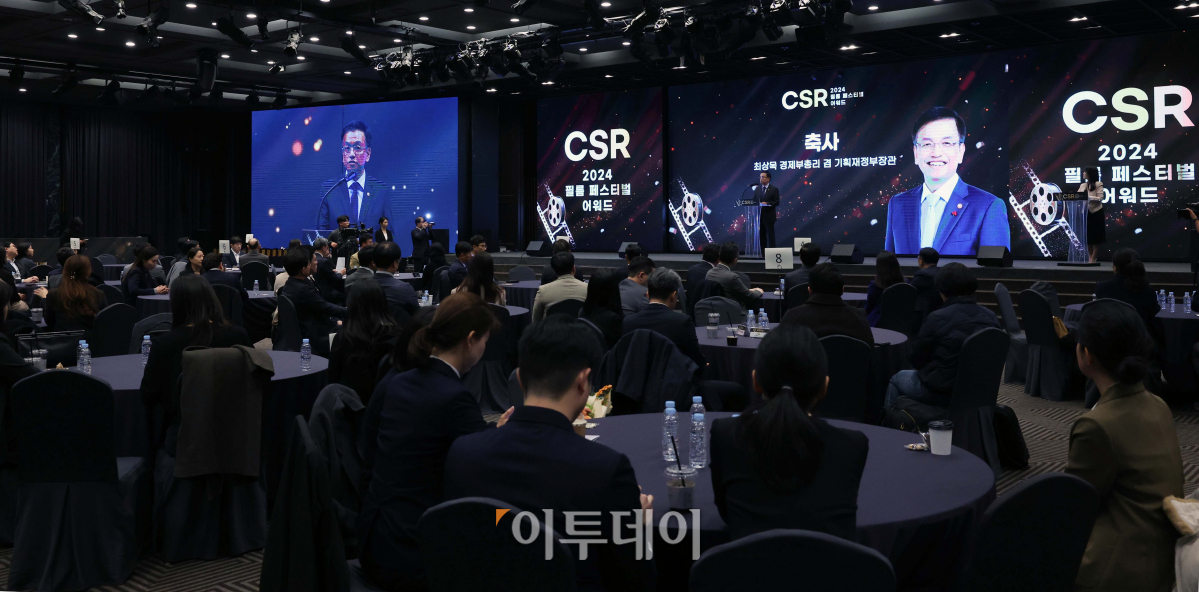최상목 부총리 겸 기획재정부 장관이 21일 서울 여의도 중소기업중앙회에서 열린 '2024 CSR 필름 페스티벌 어워드’에서 축사를 하고 있다. 경제신문 이투데이가 주최한 이 행사는 한 해 동안 사회적 가치 창출을 위한 CSR 활동 발자취를 공모하고 그 업적을 격려하기 위해 마련된 자리로 2012년 첫걸음을 내디뎌 올해로 13회째를 맞이했다.