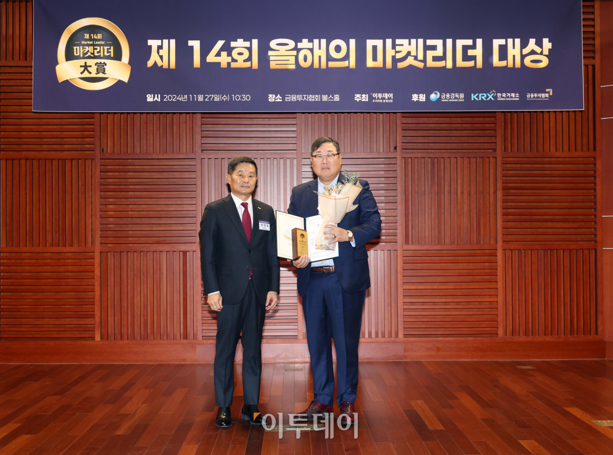 27일 서울 여의도 금융투자협회에서 열린 ‘제14회 이투데이 올해의 마켓리더 대상’ 시상식에서 IB부문 한국거래소 이사장상을 수상한 조병헌 KB증권 IB부문장(부사장)이 시상자인 양태영 한국거래소 부이사장과 기념촬영을 하고있다. ‘이투데이 올해의 마켓리더 대상’은 한 해를 마무리하며 증권업계를 이끈 마켓리더들의 노력과 성과를 고취하고, 금융투자 업계의 발전과 건전한 투자 문화 정착을 위한 시장 분위기를 조성하고자 진행되는 행사다.