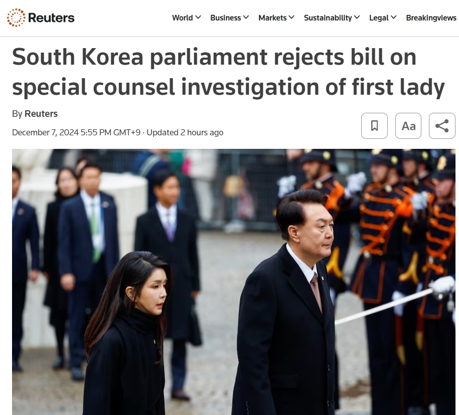 로이터통신을 포함한 주요 외신이 “한국의 여당 국회의원들이 윤석열 대통령 부인에 대한 특별검사 임명을 반대한 끝에 해당 법안이 폐기됐다”고 발 빠르게 보도했다.