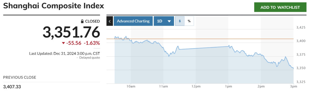 31일 올해 마지막 아시아 증시는 중국의 낙폭이 두드러졌다. 일본 증시는 전날 사상 최고가를 기록하며 올해 거래를 마쳤다.