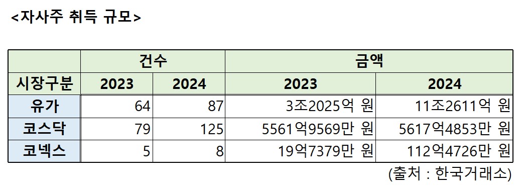 5일 한국거래소에 따르면 유가증권시장의 지난해 자사주 취득 공시 건수는 87건으로 2023년 64건보다 35.9% 증가했다. 코스닥 상장사들은 79건에서 125건으로 58.2% 늘어나면서 유가증권시장보다 높은 증가율을 보였다. 코넥스 시장은 5건에서 8건 늘었다.