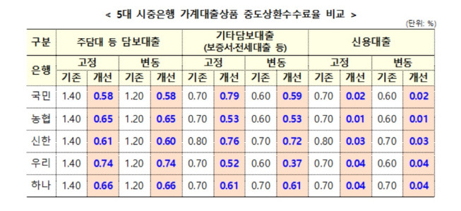 5대은행 평균 주담대 중도상환수수료율 고정금리 0.75%p↓