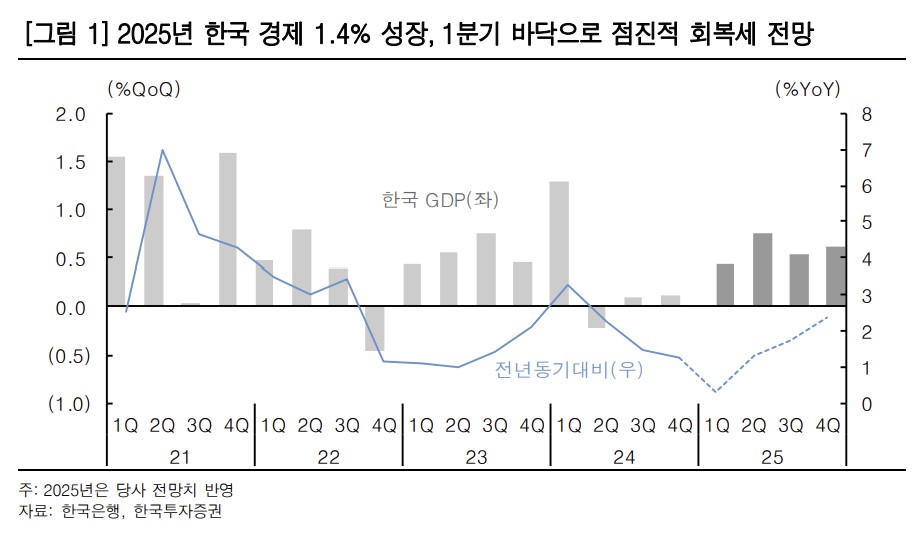 경기 방어를 위한 정책 대응이 상반기에 집중되며 상저하고의 성장 흐름을 전망했다. 문 연구원은 "재정 정책 차원에서는 재정 조기 집행이 진행되는 가운데 2분기 중 추경 가능성을 높게 보고 있다. 더불어 금통위의 추가 3회 기준금리 인하가 예상되는 가운데 실질 금리가 하락하며 경기 하방 압력을 일부 상쇄할 것으로 예상한다"고 했다.
