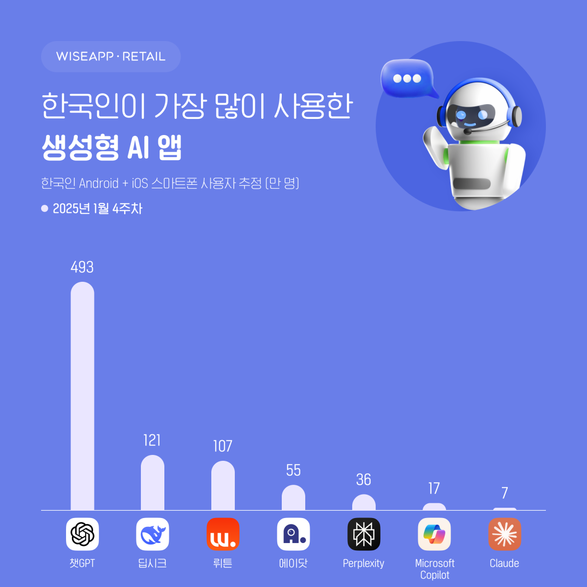 이어서 올해 1월 말 출시된 중국의 생성형 AI 딥시크가 121만 명으로 2위를 차지하며 빠른 성장세를 보였다.