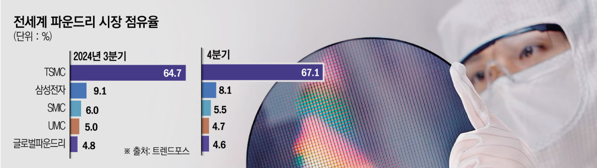 한편 시장조사업체 트렌드포스에 따르면 지난해 4분기 기준 삼성전자의 글로벌 파운드리 시장 점유율은 8.1%로, 전 분기 대비 1%포인트(p) 줄었다. 반면 같은 기간 TSMC는 점유율을 64.7%에서 67.1%로 늘리면서 삼성전자와의 격차를 더 벌렸다.