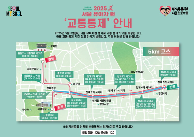 주요 도로를 대상으로 오전 8시부터 11시 10분까지 구간별 통제와 해제가 진행된다. 구체적인 교통통제 시간과 우회 구간 등 자세한 사항은 ‘2025 서울 유아차 런(Run)’ 누리집(https://seoulstrollerrun.co.kr)을 참고하면 된다.