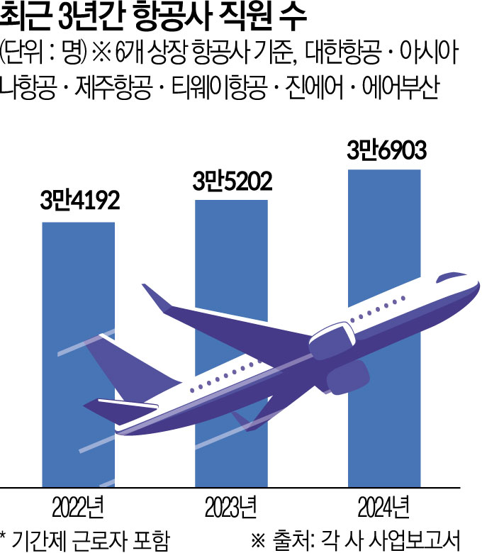 최근 3년간 항공사 직원 수는 꾸준히 늘어나는 추세다. 코로나19 엔데믹에 접어든 2022년 3만4192명에서 2023년 3만5202명으로 2.95% 늘어났다. 지난해엔 3만6903명으로 코로나19 전인 2019년 3만7230명에 근접하게 증가했다.