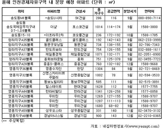올 하반기에 인천경제자유구역(송도,청라,영종)에서 분양될 아파트(임대제외)는 총 19곳 1만7125가구인 것으로 조사됐다.