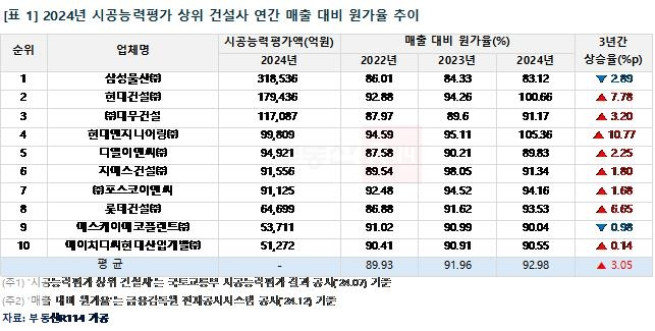 분양가 상승은 건설사에도 부담이다. 건자재와 인건비 상승으로 원가가 높아진 가운데 수익성은 악화되고 있다. 지난해 시공능력평가 상위 10대 건설사의 평균 매출 대비 원가율은 92.98%다. 특히 현대건설(100.66%)과 현대엔지니어링(105.36%)은 원가율이 100%를 넘어 적자를 기록했고 포스코이앤씨(94.16%), 롯데건설(93.53%), GS건설(91.34%) 등도 90%를 웃돌았다.
