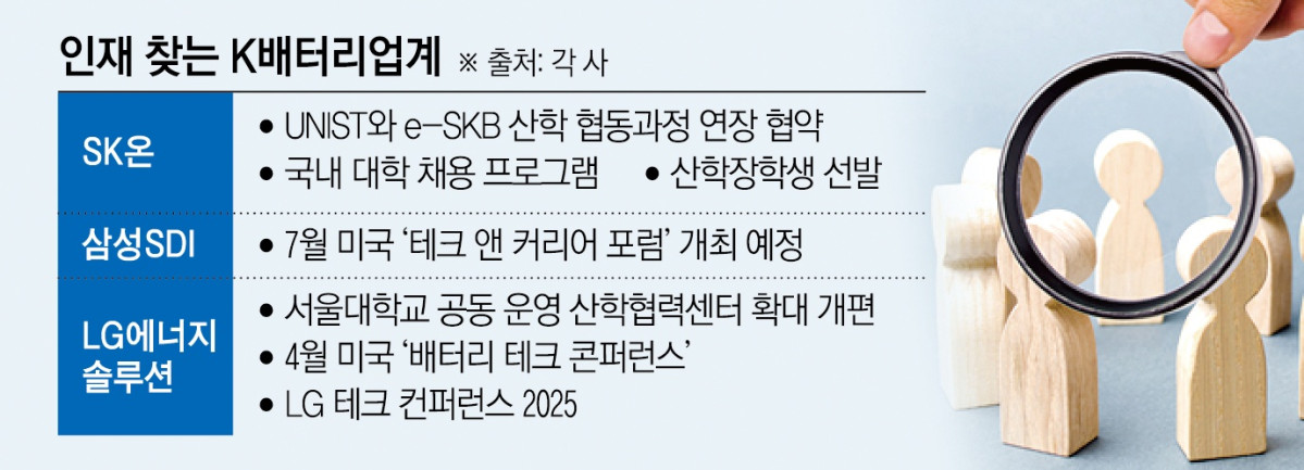LG에너지솔루션도 최근 서울대학교와 2022년부터 공동으로 운영해 온 산학협력센터를 확대 개편하기로 하며 우수 인재 양성에 더욱 집중하기로 했다. 지난달에는 미국 시카고에서 ‘배터리 테크 콘퍼런스’를 열고 글로벌 인재 채용에 나서기도 했다. 해당 일정에는 김동명 LG에너지솔루션 사장을 비롯한 주요 경영진들이 총출동했다.
