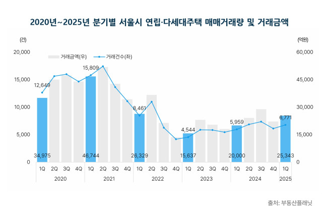 29일 부동산플래닛이 발표한 ‘2025년 1분기 서울 연립·다세대주택 시장 동향 보고서’에 따르면 1분기 서울 연립·다세대 매매거래량은 6771건으로 전 분기(6115건) 대비 10.7%, 전년 동기(5959건) 대비 13.6% 증가했다. 거래금액은 2조5343억 원으로 집계돼 각각 14.4%, 26.7% 상승했다. 월별로는 1월 1584건에서 3월 3070건으로 꾸준히 증가세를 보였다.