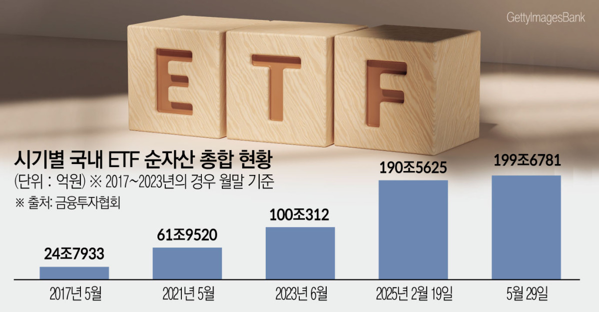 1일 금융투자협회에 따르면 지난달 29일 기준 국내 상장된 ETF 순자산 합산 금액은 199조6781억 원으로 집계됐다. 28일 199조430억 원이던 ETF 총 순자산은 29일 미국발(發) 관세 우려 완화에 따른 국내외 증시 급등에 힘입어 하루 만에 6000억 원 넘게 늘었다.