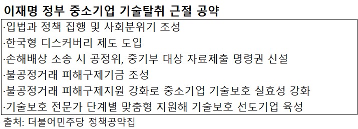 이러한 불공정한 시장 질서를 바로잡기 위해 새 정부는 기술 탈취 근절을 위한 제도 개선에 팔을 걷어붙일 걸로 보여 업계의 기대가 크다. 이재명 대통령은 대선 공약에 ‘기술을 탈취한 기업은 망한다’라는 대원칙 아래 입법과 정책 집행, 사회 분위기를 조성한다고 담았다. 구체적인 핵심 방안으로 △한국형 디스커버리 제도 도입 △손해배상 소송 시 법원의 공정위, 중기부에 대한 자료제출명령권 신설 등을 제시했다.