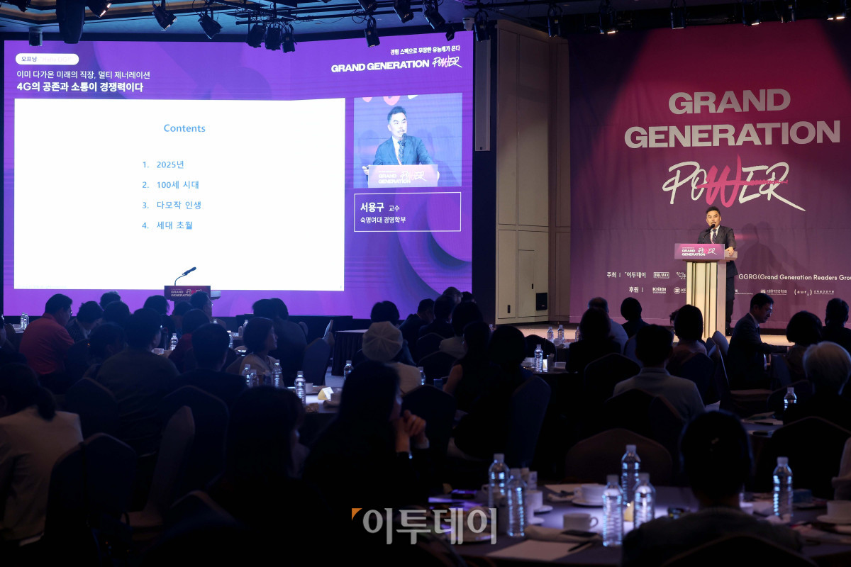 서용구 숙명여대 경영학부 교수가 17일 서울 중구 앰배서더 서울 풀만 호텔에서 열린 ‘2025 그랜드 제너레이션 콘퍼런스(GGC)’에서 ‘이미 다가온 미래의 직장, 멀티 제너레이션’을 주제로 강연하고 있다. 올해로 3회째를 맞이한 GGC 2025는 ‘새로운 성장을 이끄는 힘 그랜드 제너레이션 파워’를 주제로 각 분야의 전문가들이 모여 초고령화 사회로의 전환에 대한 대응법을 모색하는 자리다.