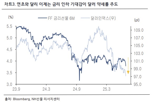 위재현 NH선물 연구원은 "지정학 리스크가 일단락된 이후, 이번 주는 연준에 대한 트럼프의 압박이 부각되며 약달러 분위기가 심화했다"며 "다만 금리 인하에 대한 기대감과 별개로, 달러화는 이미 연초대비 10%가량 하락하며 낙폭 과대에 대한 인식은 여전하다"고 짚었다.