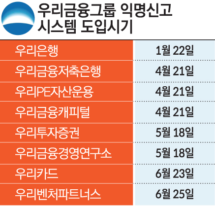 6일 금융권에 따르면 올해 초 우리은행을 시작으로 저축은행·자산운용·캐피털·증권·카드 등 자금관리 업무를 하는 6개 핵심 계열사를 비롯한 8곳(경영연구소·벤처파트너스 포함)이 컴플라이언스 전문업체 레드휘슬의 익명신고시스템인 ‘헬프라인’을 도입했다.