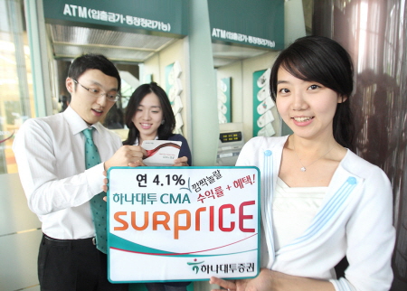 하나대투증권에 따르면 CMA 상품인 'Surprice CMA'가 7월 한달동안 월간 시장점유율 증가 속도가 증권업계 1위로 올라섰다. 5월말 이후 CMA 계좌수 증가도 1위다.