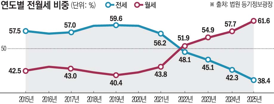 임대차 시장의 중심축이 완전히 바뀌었다. 한때 '내 집 마련 전 단계'로 여겨졌던 전세는 주류 자리에서 밀려 시장점유율 40% 아래로 추락했다. 대신 차선책으로 여겨져왔던 월세가 새로운 표준으로 자리 잡고 있다.