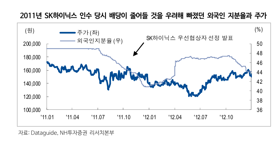 주가 방어의 핵심은 배당이다. SK텔레콤은 주당 3540원의 배당을 유지할 경우 배당수익률이 6.3%에 이른다. NH투자증권은 7월 말 열릴 이사회에서 반기 배당금이 전분기 수준(830원)으로 결정된다면 더 이상의 악재는 없을 것으로 내다봤다.