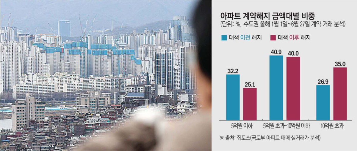 취소된 계약 중 5억 원 이하 아파트 비중은 대책 발표 전 32.2%에서 이후 25.1%로 줄었다. 정부는 6·27 부동산 대출 규제를 통해 수도권 주택담보대출 6억 원 제한을 걸었는데, 5억 원 이하는 이에 대한 영향이 없는 물량이다.