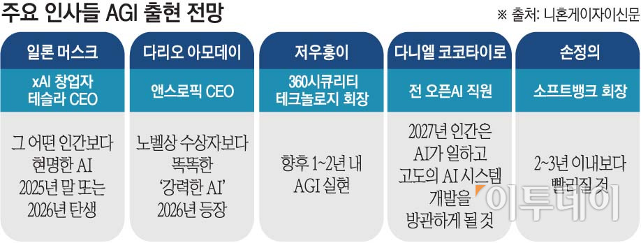 일론 머스크 테슬라 최고경영자(CEO)는 “그 어느 인간보다 현명한 AI의 탄생 시기는 올해 말이나 내년”이라고 단언했다. 다리오 아모데이 앤스로픽 CEO도 “대부분 분야에서 노벨상 수상자보다 똑똑한 강력한 AI는 이르면 내년 실현된다”고 내다봤다. 중국의 IT 거물로 불리는 저우훙이 360시큐리티테크놀로지(옛 치후360) 회장 역시 “AGI는 향후 10~20년 이야기가 아니다. 1~2년 안에 현실화한다”고 말했다.