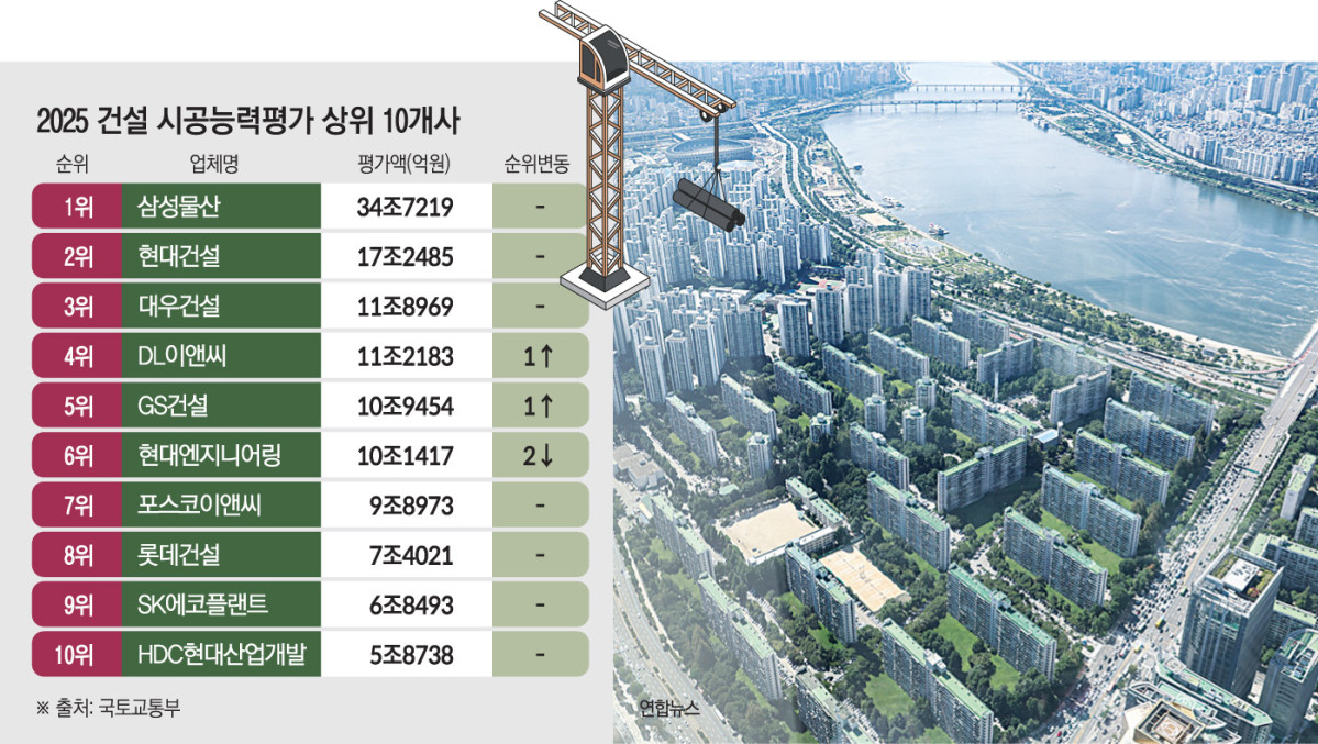 삼성물산이 2025년도 건설사 시공능력평가에서 1위를 차지하며 12년 연속 정상 자리를 지켰다. 현대건설과 대우건설 역시 나란히 2·3위를 유지하며 시공능력평가 ‘톱3’ 구도를 굳혔다.
