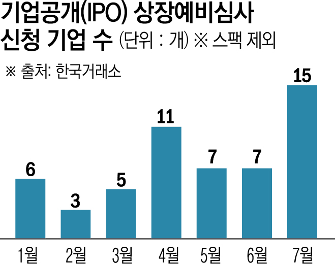 21일 한국거래소에 따르면 IPO 제도 시행 이후 7월 한 달간 IPO 예비심사 신청 건수는 15건으로 상반기 월평균 신청 건수(6.5건)를 웃돌았다. 월별로 보면 △1월 6건 △2월 3건 △3월 5건 △4월 11건 △5월 7건 △6월 7건 △7월 15건으로 지난달이 가장 많았다.